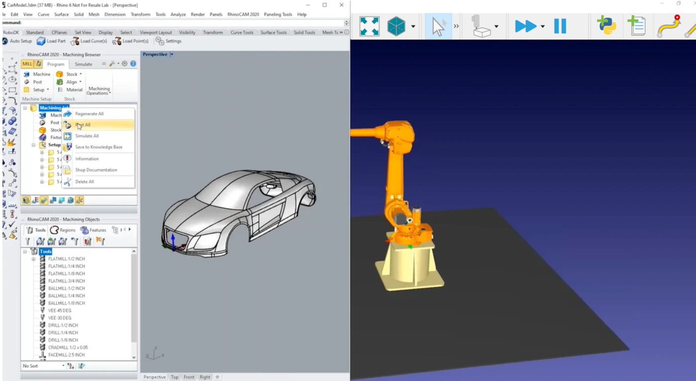 本节展示如何从Mecsoft RhinoCAM软件导出加工程序到RoboDK。使用APT文件将刀具路径加载到RoboDK,并通过自定义BAT文件自动发送。
