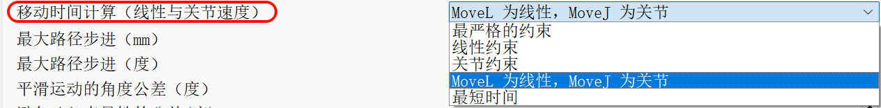 Note:在运动选项卡(工具➔选项➔运动),可以指定关节/线性速度/加速度如何以正确的时序应用于关节和线性运动,并准确计算循环时间。例如,优傲(Universal Robots)对线性运动使用线性速度和加速度,对关节运动使用关节速度和加速度(RoboDK中的默认设置)。其他机器人控制器可能会应用最严格的限制。其他机器人制造商可能不允许提供数值形式的加速度参数。